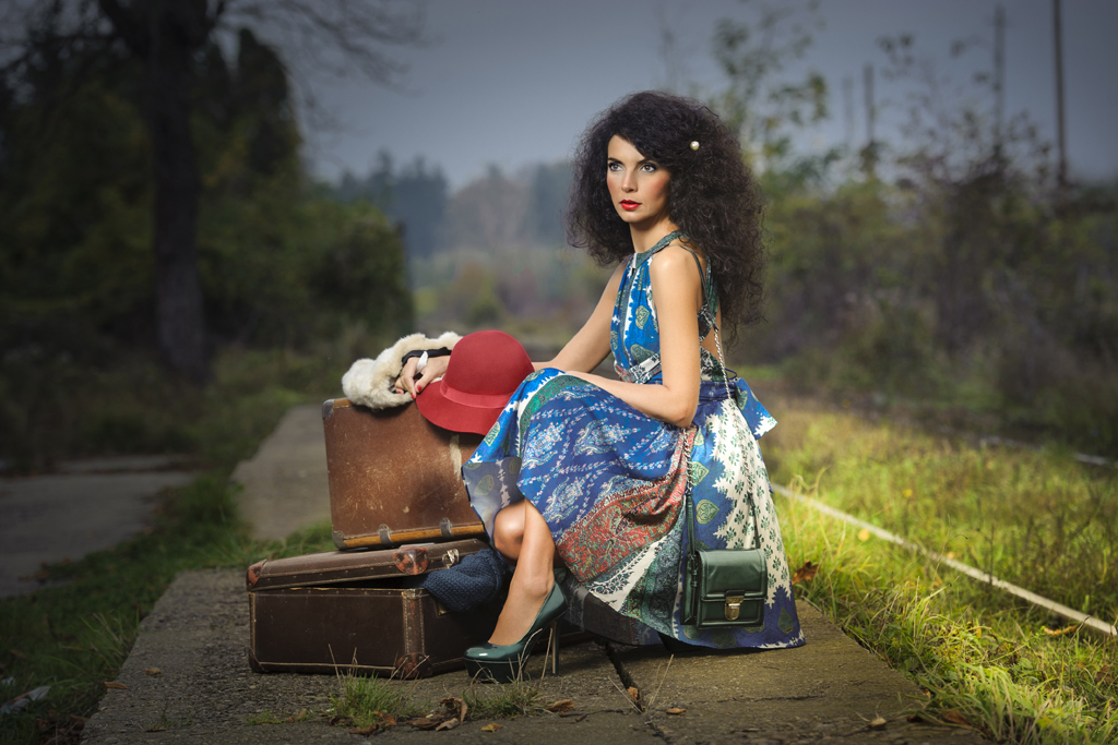 The rest of the look is the result of my free imagination while swimming early in the morning to catch the train. In broad lines, my retro chic style: pin up shoes with mini bag Ela both in the same color: dark green, silk retro print open-back dress which I think that gives a woman the most seductive air, props just for fun.
