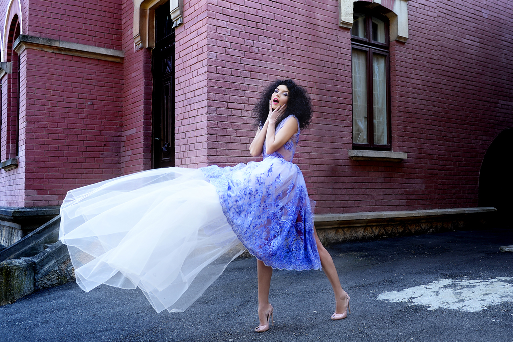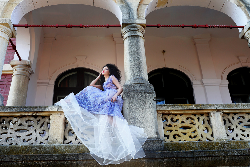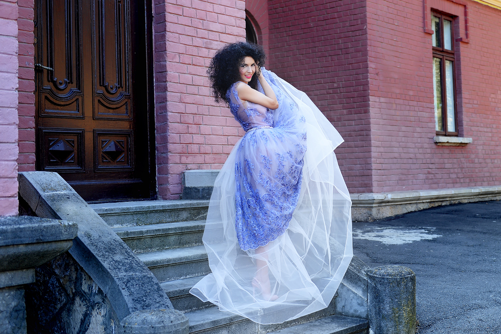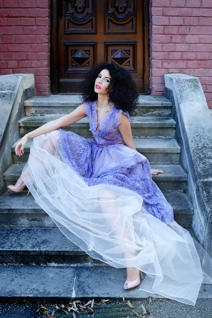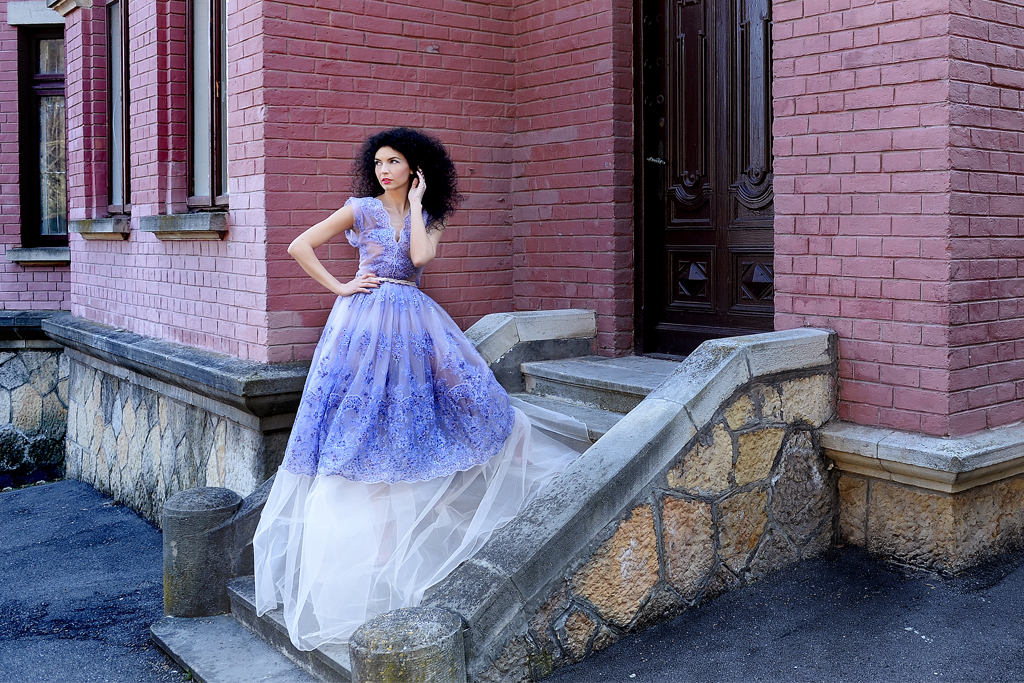 Cu ce incepem? Vorbim despre casa din vis sau rochia din povesti? Impreuna, rochia din tulle brodat cu dantela, margele marunte si paiete delicate in culoarea lavandei si vila Mirea imi par seducatoare si inseparabile!